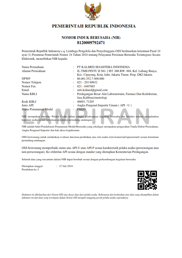 - Sertifikat Standar Balai/Institusi Pengujian Fasilitas Kesehatan PT. Kalmed Sejahtera Indonesia nomor : 81200097924710002