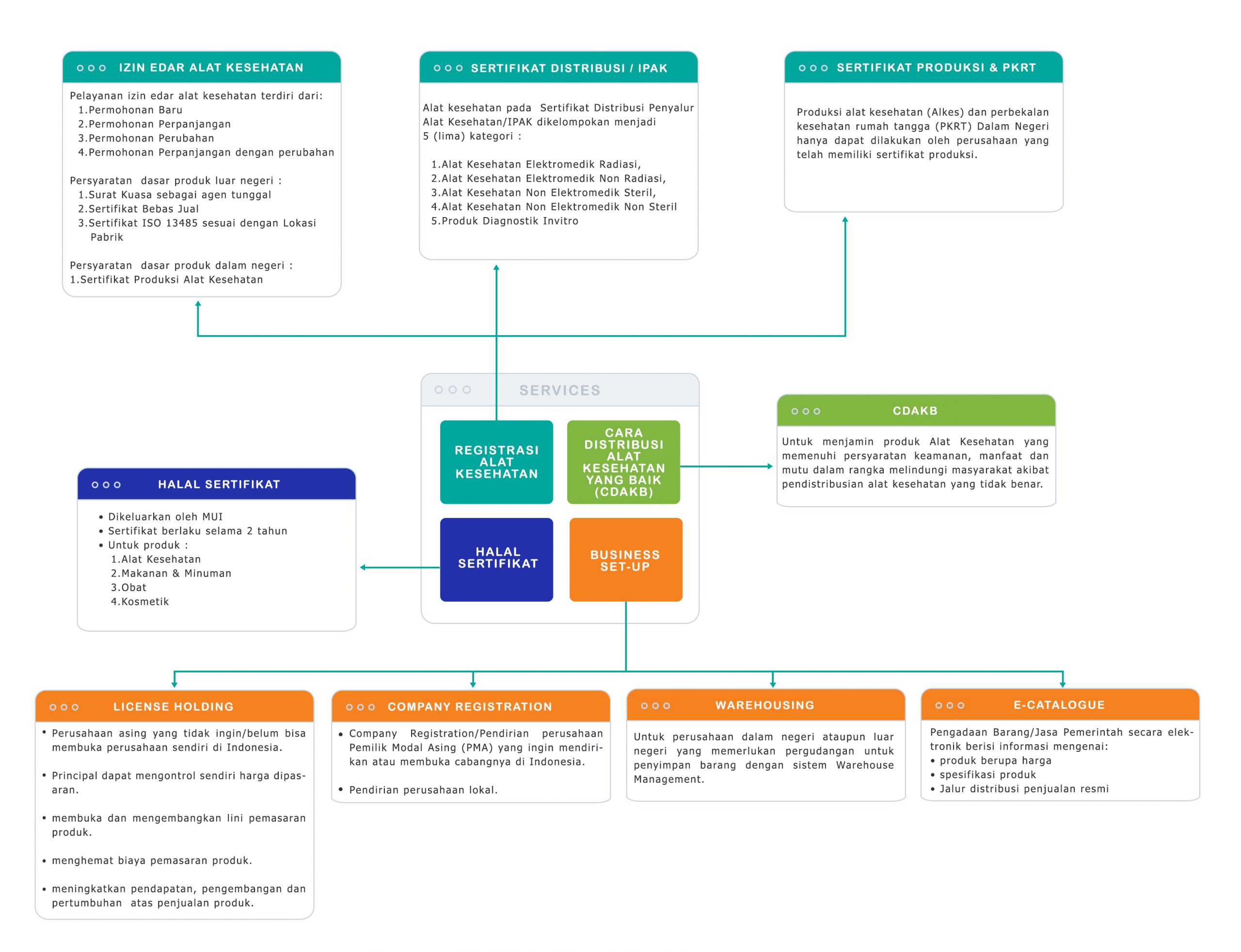 Ruang lingkup layanan kami adalah Konsultan Regulatory yang meliputi pendaftaran izin distribusi Alat Kesehatan ke Kementerian Kesehatan, Pemegang lisensi izin distribusi alat kesehatan termasuk mengelola produk Impor, E-Katalog, Penyewaan Gudang, Sertifikat Halal, Surat Tanda Pendaftaran (STP) dan Cara Distribusi Alat Kesehatan yang Baik (CDAKB).